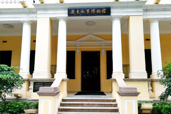 廣東外事博物館原為民國時期法國駐廣州領事館,建于1890年,是沙面建筑群中的A類文物建筑,全國重點文物保護單位。除了收藏了改革開放以來廣東的外事禮品以及重要外事活動的圖片外,還特意利用旋轉樓梯的空間展示了十多幅百年前的沙面老照片,其中有一幅照片記錄下百年前洋務翻譯拖著長辮身穿大褂的身影,這幅懸掛在二樓大廳的老照片,不但完整地反映了當年沙面西橋景色,而且可以看到當時行走在英法領事區的洋務翻譯依然保留清裝打扮。